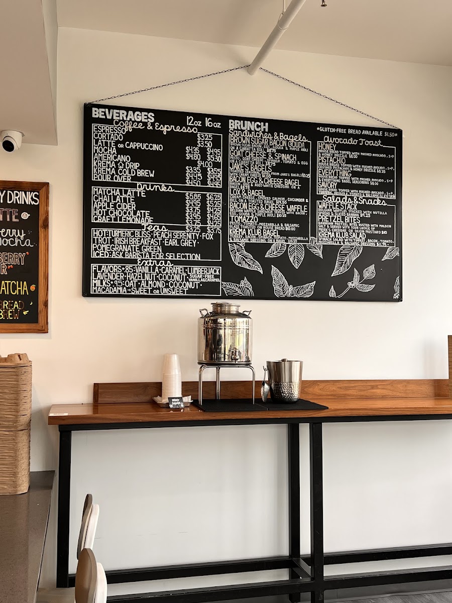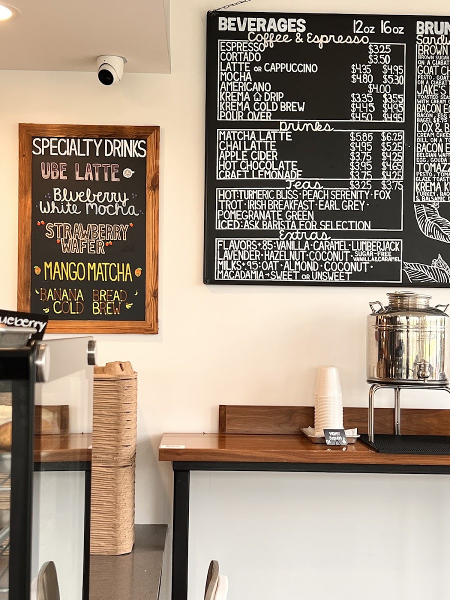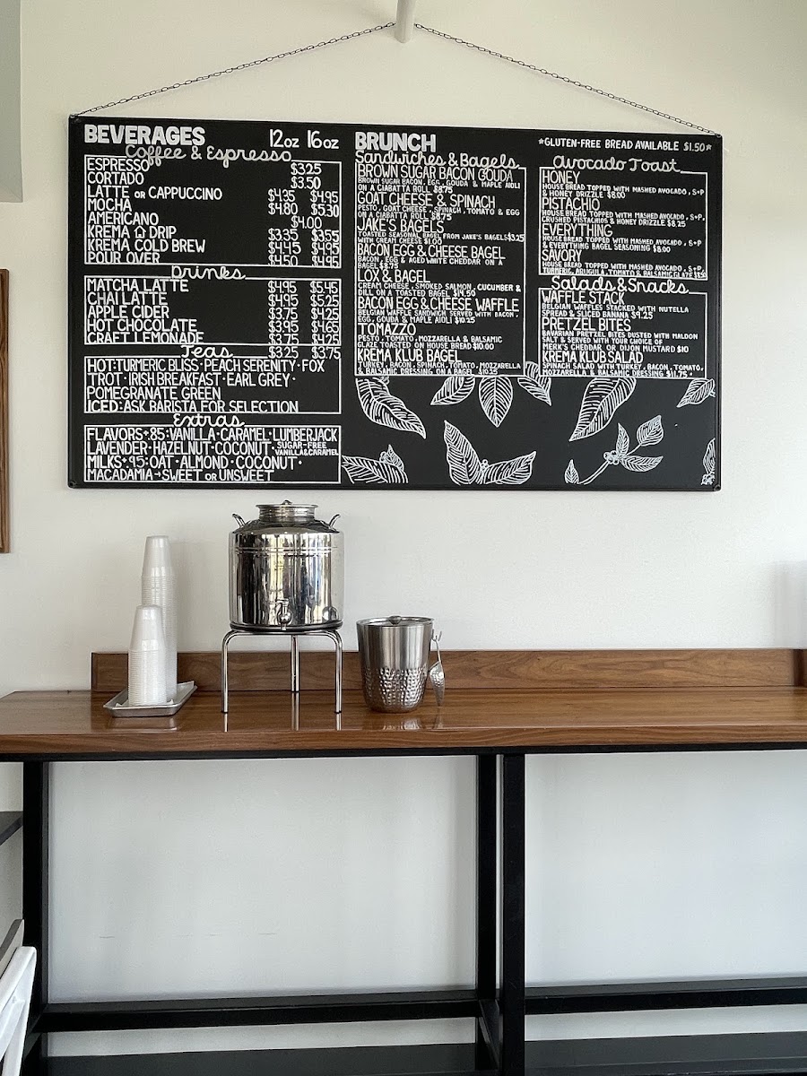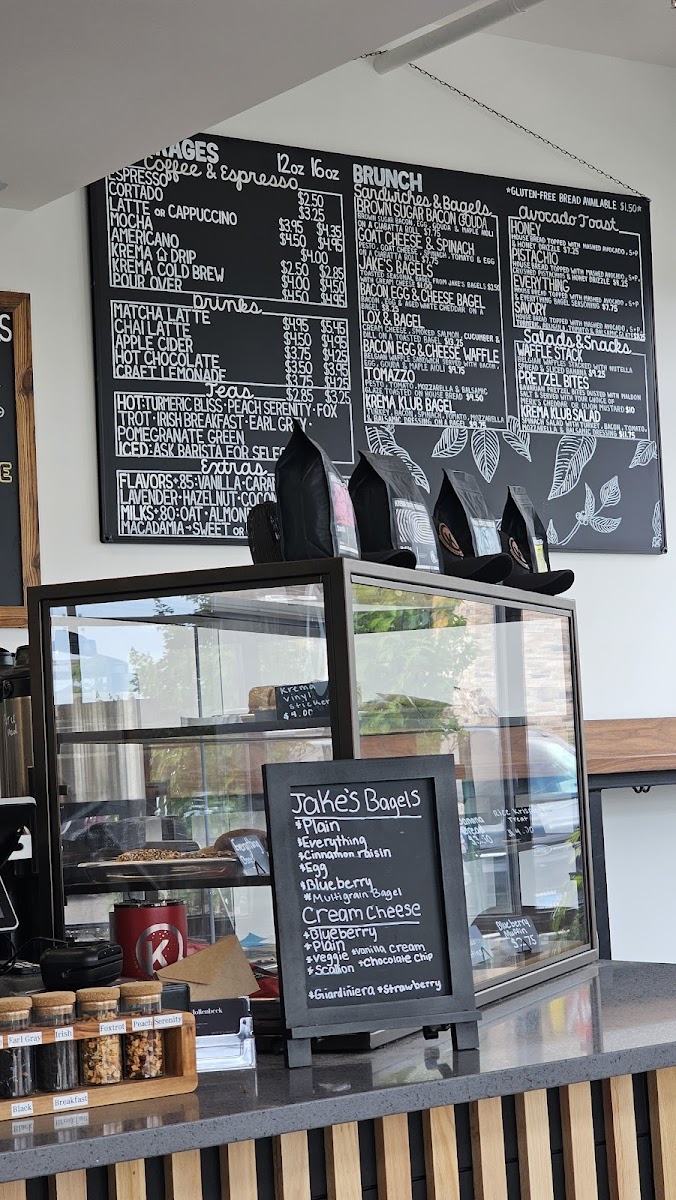 The menu at Krema Coffee Roasters in North Aurora offers a delightful variety of beverages and brunch options that cater to diverse tastes. Their espresso drinks include a classic Espresso, Traditional Macchiato (Espresso with a dollop of foam), and the rich Cappuccino and Flat White (5oz). If you prefer something creamier, their Latte is a great choice. For coffee lovers looking for something cold, the Cold Brew and the more unique Peppermint Bark Cold Brew with Maple Cinnamon Cold Foam are must-tries. The menu also features refreshing options like Pour Over, Apple Cider, and indulgent Matcha Latte and Chai Latte, alongside creative drinks such as Craft Lemonade and the whimsical Unicorn Tears. For a satisfying brunch, guests can enjoy a selection of bagels, including the savory Brown Sugar Bacon Gouda, Goat Cheese Spinach Tomato and Egg, and the classic Bacon Egg & Cheese Bagel. The Lox and Bagel offers a fresh and delicious twist on this brunch favorite. For a quick snack, the Grab & Go section includes Bottled Soda, RMBR Kombucha, Open Water Still, and Sparkling waters, as well as Kids Juice Boxes for the little ones. Whether you're in the mood for a strong espresso or a light brunch, Krema Coffee Roasters offers a variety of options that promise a satisfying experience.