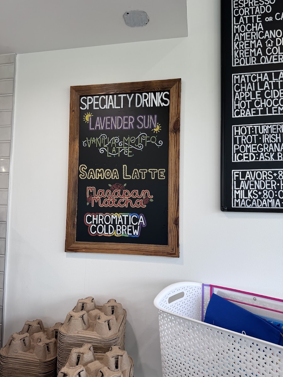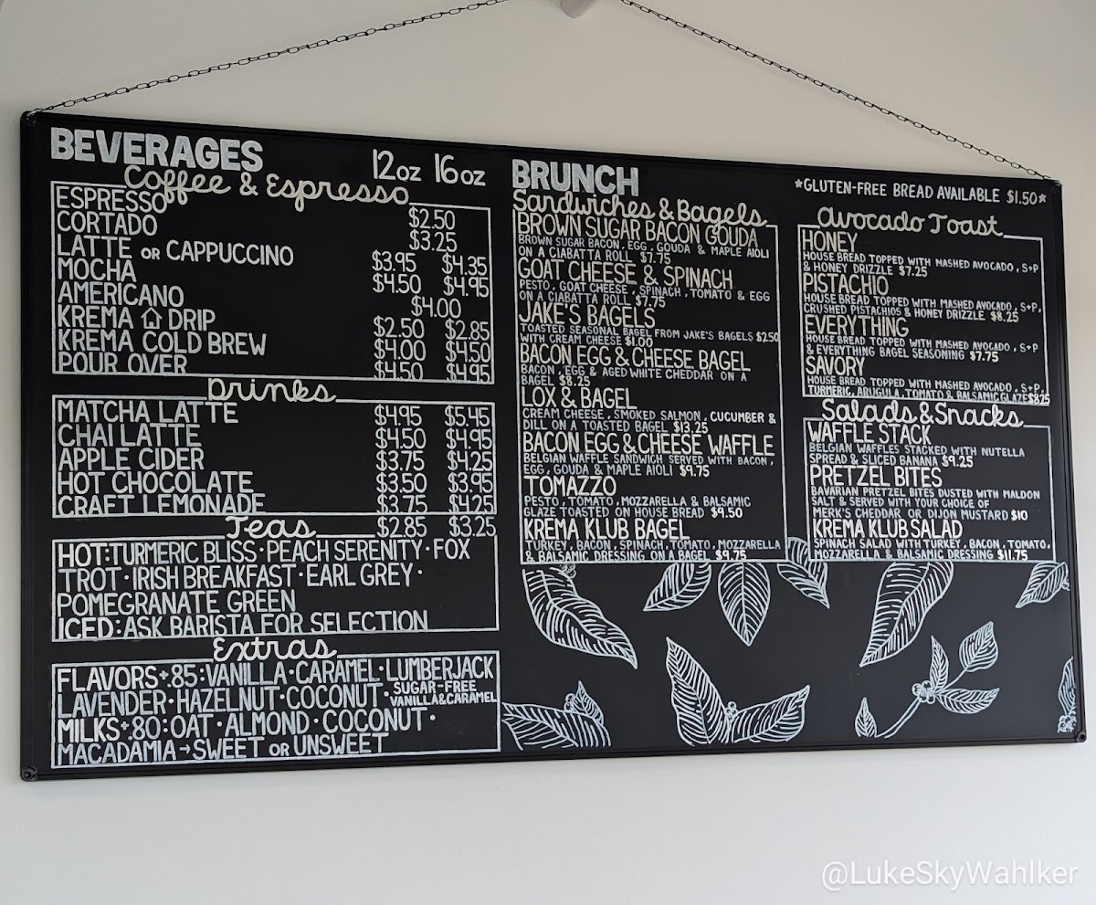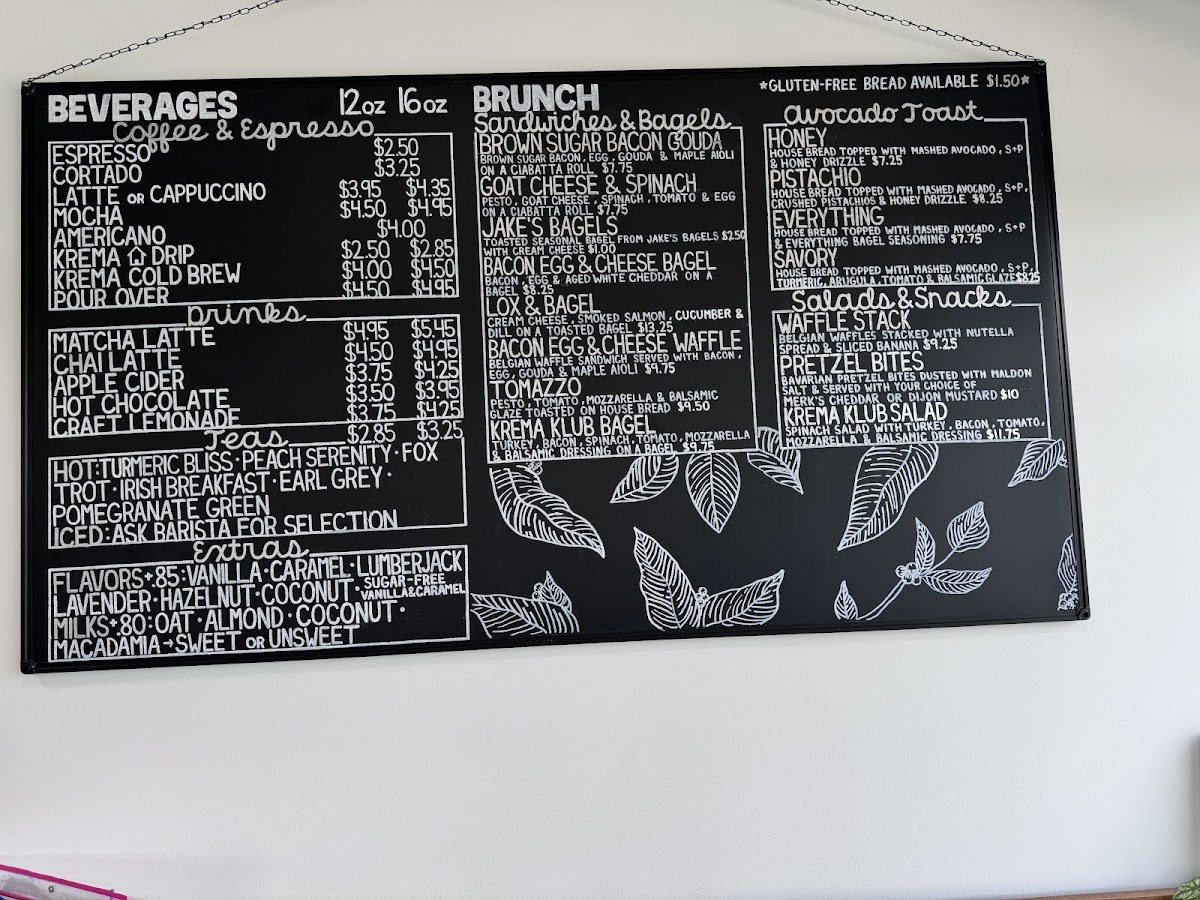The menu at Krema Coffee Roasters in North Aurora offers a delightful variety of beverages and brunch options that cater to diverse tastes. Their espresso drinks include a classic Espresso, Traditional Macchiato (Espresso with a dollop of foam), and the rich Cappuccino and Flat White (5oz). If you prefer something creamier, their Latte is a great choice. For coffee lovers looking for something cold, the Cold Brew and the more unique Peppermint Bark Cold Brew with Maple Cinnamon Cold Foam are must-tries. The menu also features refreshing options like Pour Over, Apple Cider, and indulgent Matcha Latte and Chai Latte, alongside creative drinks such as Craft Lemonade and the whimsical Unicorn Tears. For a satisfying brunch, guests can enjoy a selection of bagels, including the savory Brown Sugar Bacon Gouda, Goat Cheese Spinach Tomato and Egg, and the classic Bacon Egg & Cheese Bagel. The Lox and Bagel offers a fresh and delicious twist on this brunch favorite. For a quick snack, the Grab & Go section includes Bottled Soda, RMBR Kombucha, Open Water Still, and Sparkling waters, as well as Kids Juice Boxes for the little ones. Whether you're in the mood for a strong espresso or a light brunch, Krema Coffee Roasters offers a variety of options that promise a satisfying experience.